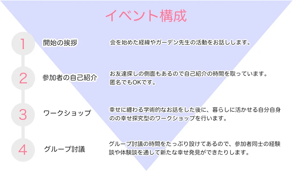 幸せについて学んだり、自己探究して書き出してみたりして明確にし、さらには、活動を通じて、お会いする人の幸せについてお話を聞いたりしていく中で、より自分の幸せを増やすことに役立ててほしいという思いで作ったサークルです。
